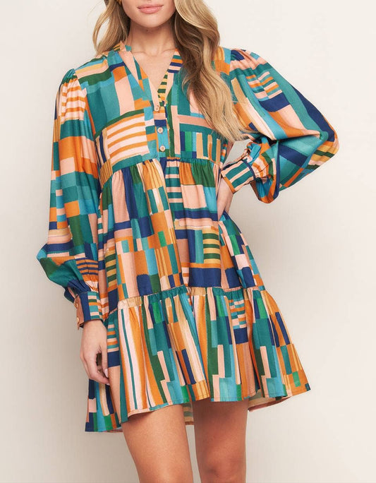 How Charming Printed V-Neck Dress - Green Rust Multi
