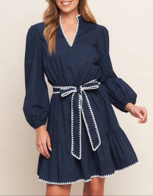 In A Hurry Tie Waist V-Neck Dress - Navy