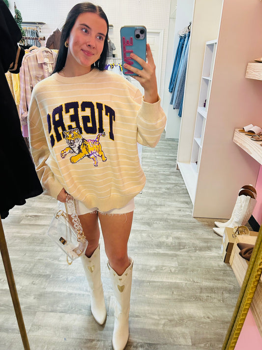 Queen Of Sparkles Licensed LSU Beige Stripe Vintage Team Sweater