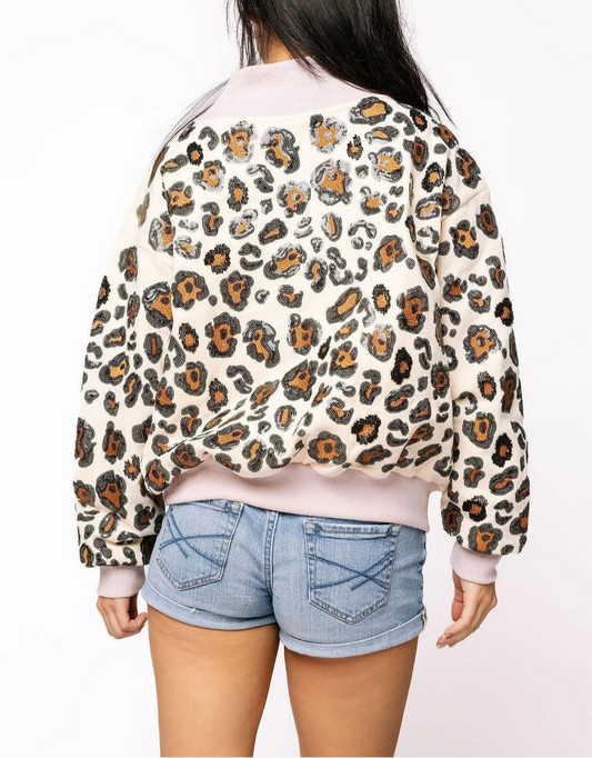 Queen Of Sparkles Ivory Leopard Mock Neck Sweatshirt With Light Pink Trim