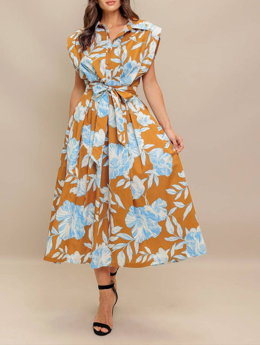 Seasons Change Floral Collared Midi Dress - Brown Blue