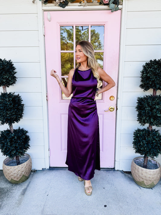 Show Stopper Twisted Shoulder Midi Dress - Plum