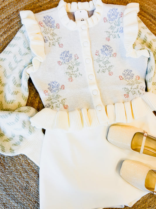 Sweet As Sugar Floral Print Ruffle Cardigan - Cream