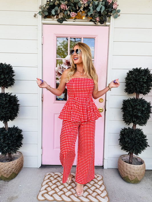 Pick Me Checkered Strapless Peplum Top - Red