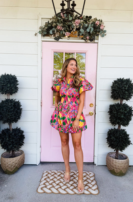 Gina Floral Puff Sleeve Mini Dress - Pink Multi