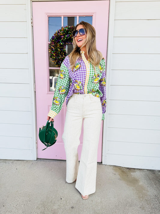 Queen Of Sparkles Colorblock Mardi Gras Gingham King Cake Button Up Top