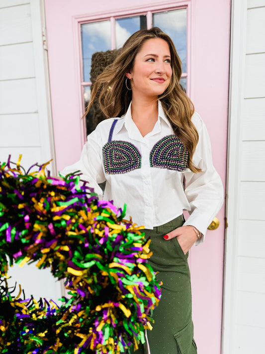 Queen Of Sparkles White Mardi Gras Beaded Bikini Button Up Top