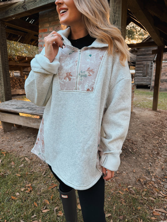 Camo Leaves Patchwork Quarter Zip Oversized Pullover - Grey