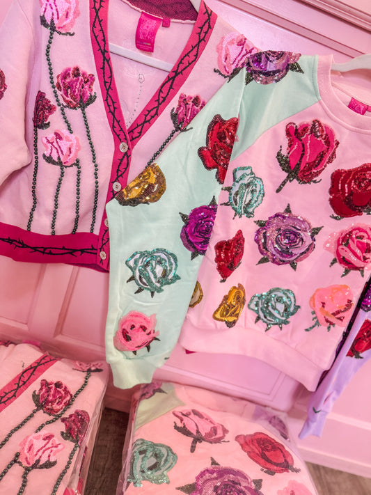 Queen Of Sparkles Color Block Velvet Roses Sweatshirt