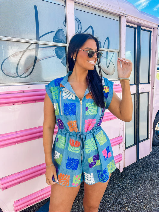 Queen Of Sparkles Denim Flower Tile Zipper Romper