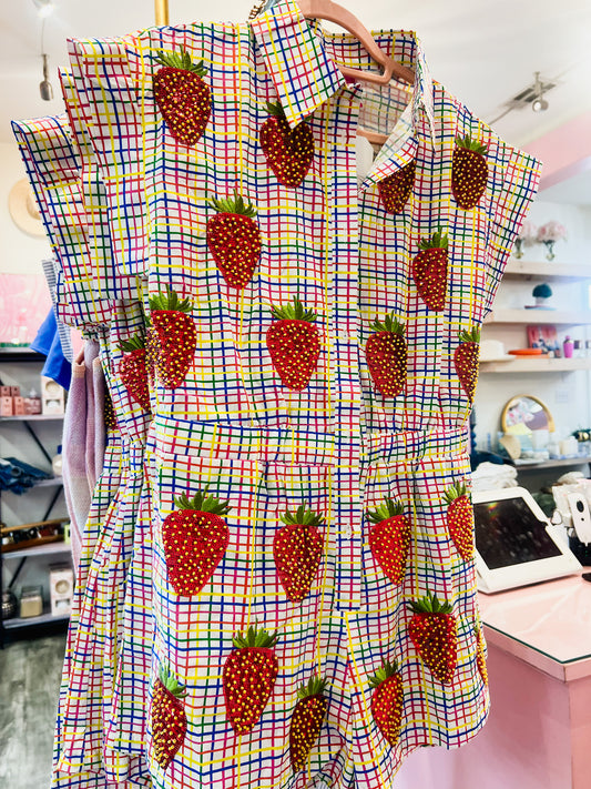 Queen Of Sparkles Rainbow Plaid Beaded Strawberry Cotton Romper