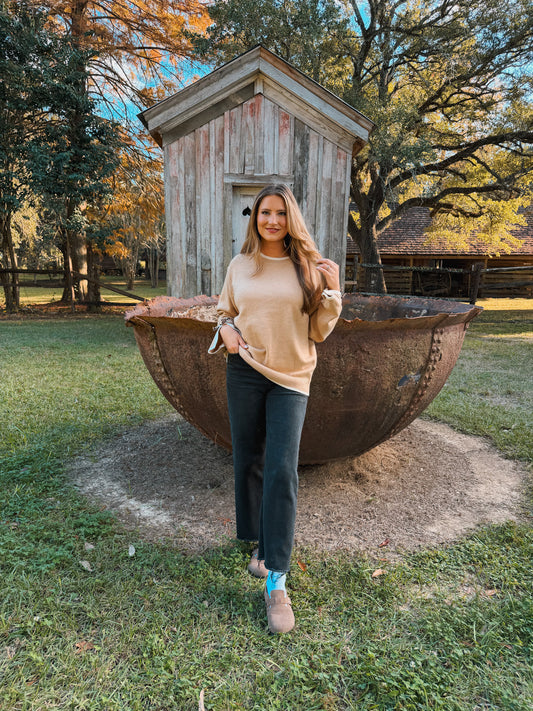 Leopard Bow Split Contrast Trim Sweater - Tan