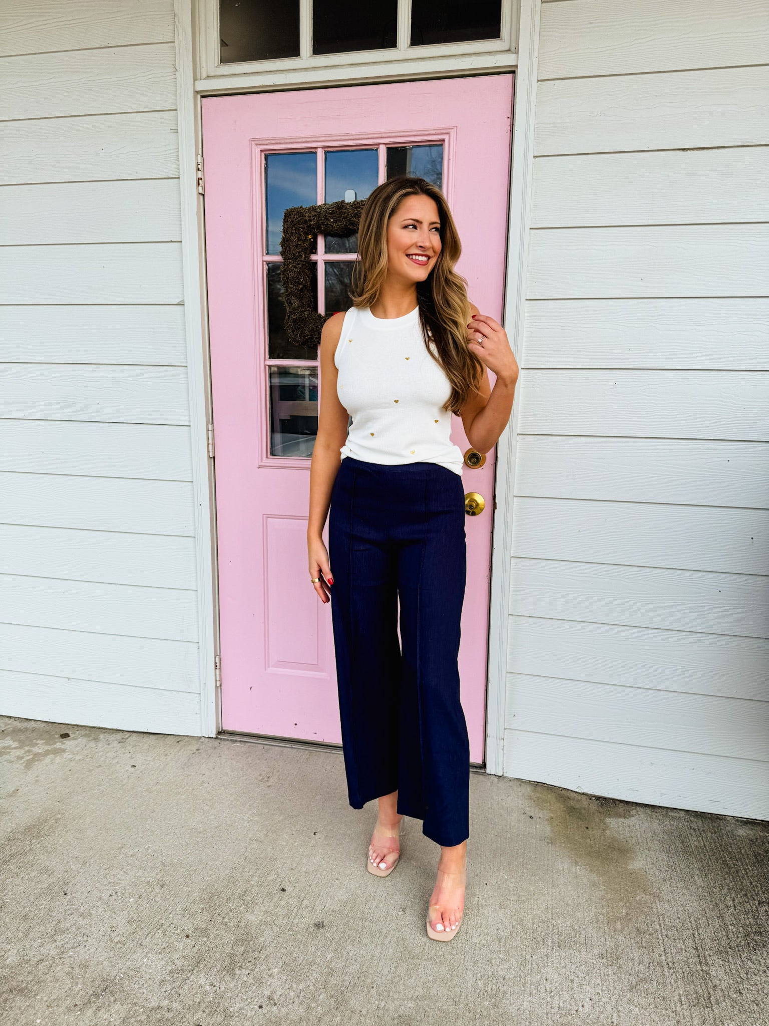 Turn heads wherever you go. The rich navy hue provides a sophisticated base for the eye-catching glitter details that catch the light with every move. Perfect for nights out, special occasions, or whenever you want to add a touch of glamour to your everyday look. These pants blend comfort with show-stopping style, making them a must-have for anyone who loves to shine.