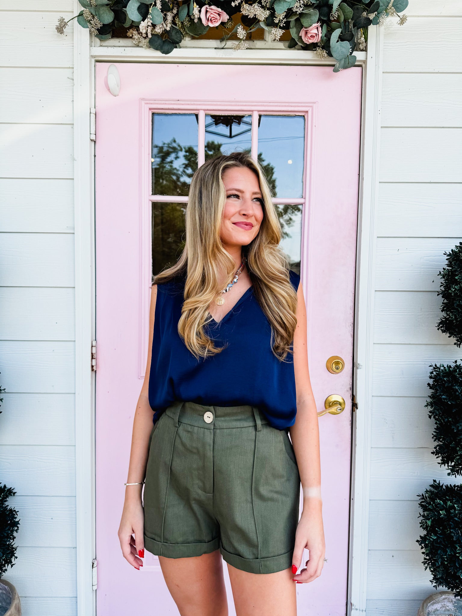 Business Casual Silk Pleated Sleeveless Top - Navy