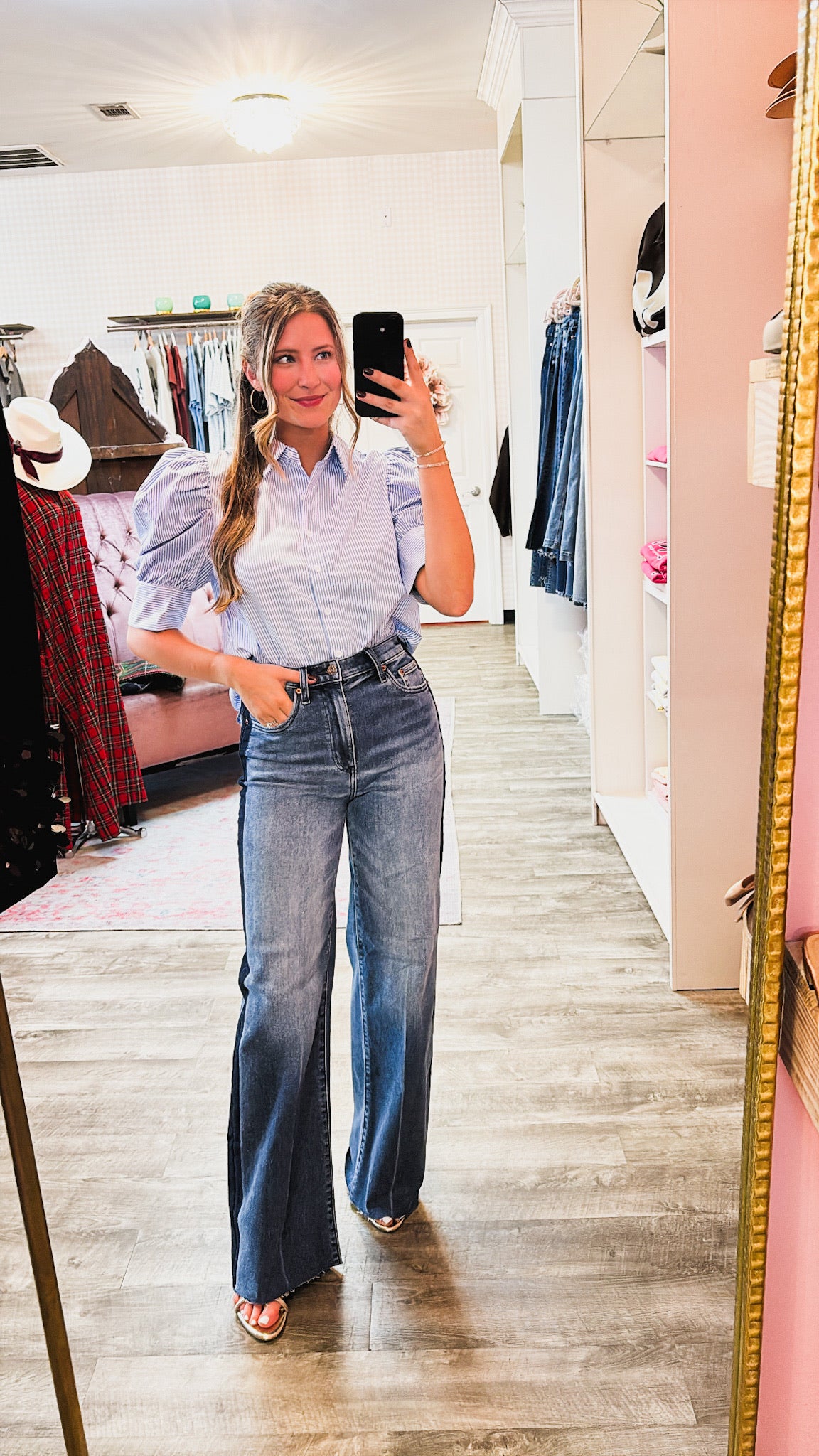 Strut your stuff in this charming collared blouse that's equal parts preppy and playful! The short puff sleeves add a flirty touch while the classic striped pattern keeps things fresh and versatile. Perfect for dressing up casual jeans or pairing with your favorite skirt, this blue beauty works overtime in your wardrobe. Whether you're heading to brunch or the office, you'll feel confident and put-together. A timeless piece that proves stripes never go out of style!