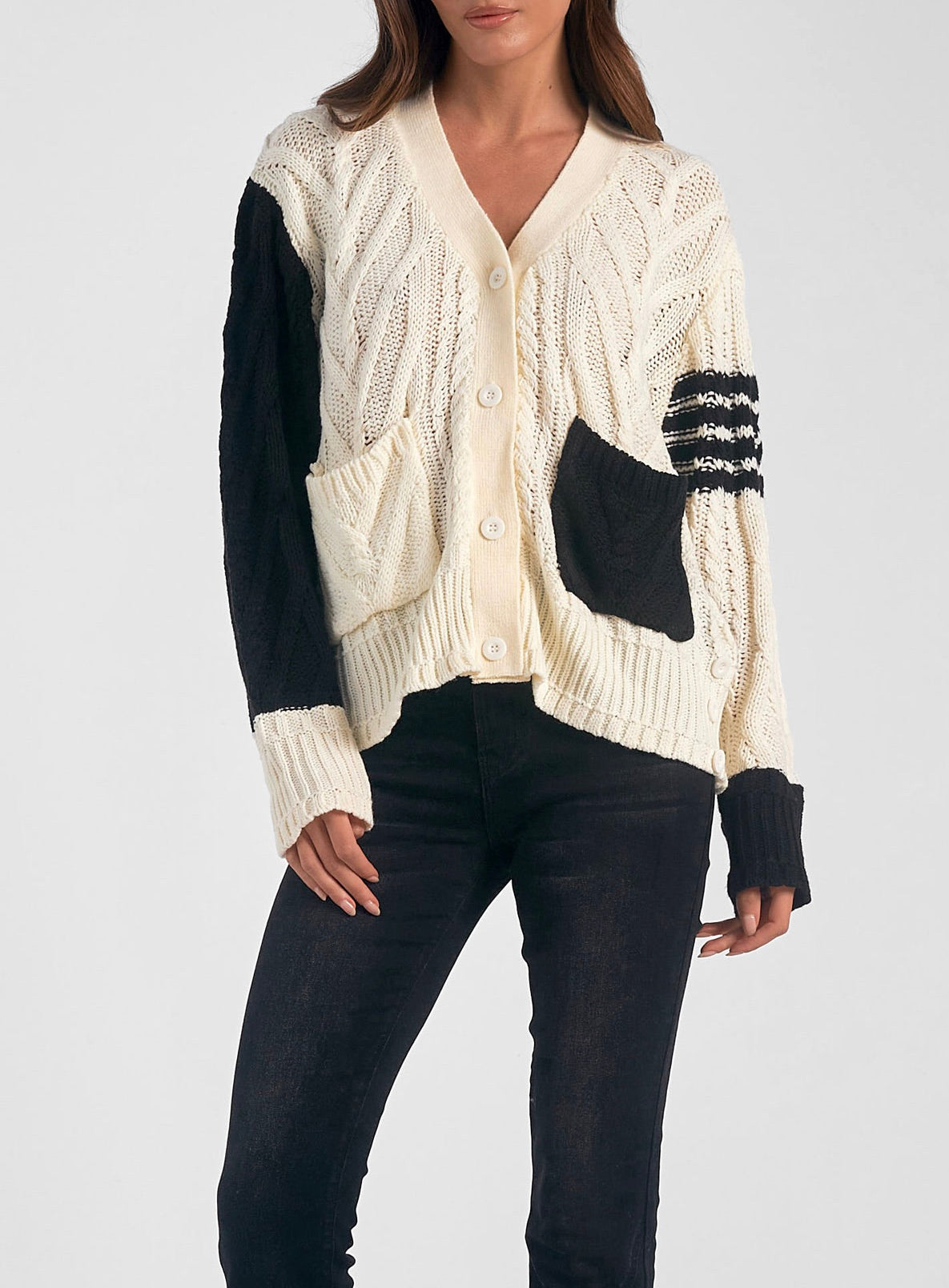 Make a statement with our Elan Color Block Sweater Cardigan! This cable knit beauty features a bold color block design and convenient front button closure with pockets. Upgrade your wardrobe with this playful, yet cozy addition. Get yours now!