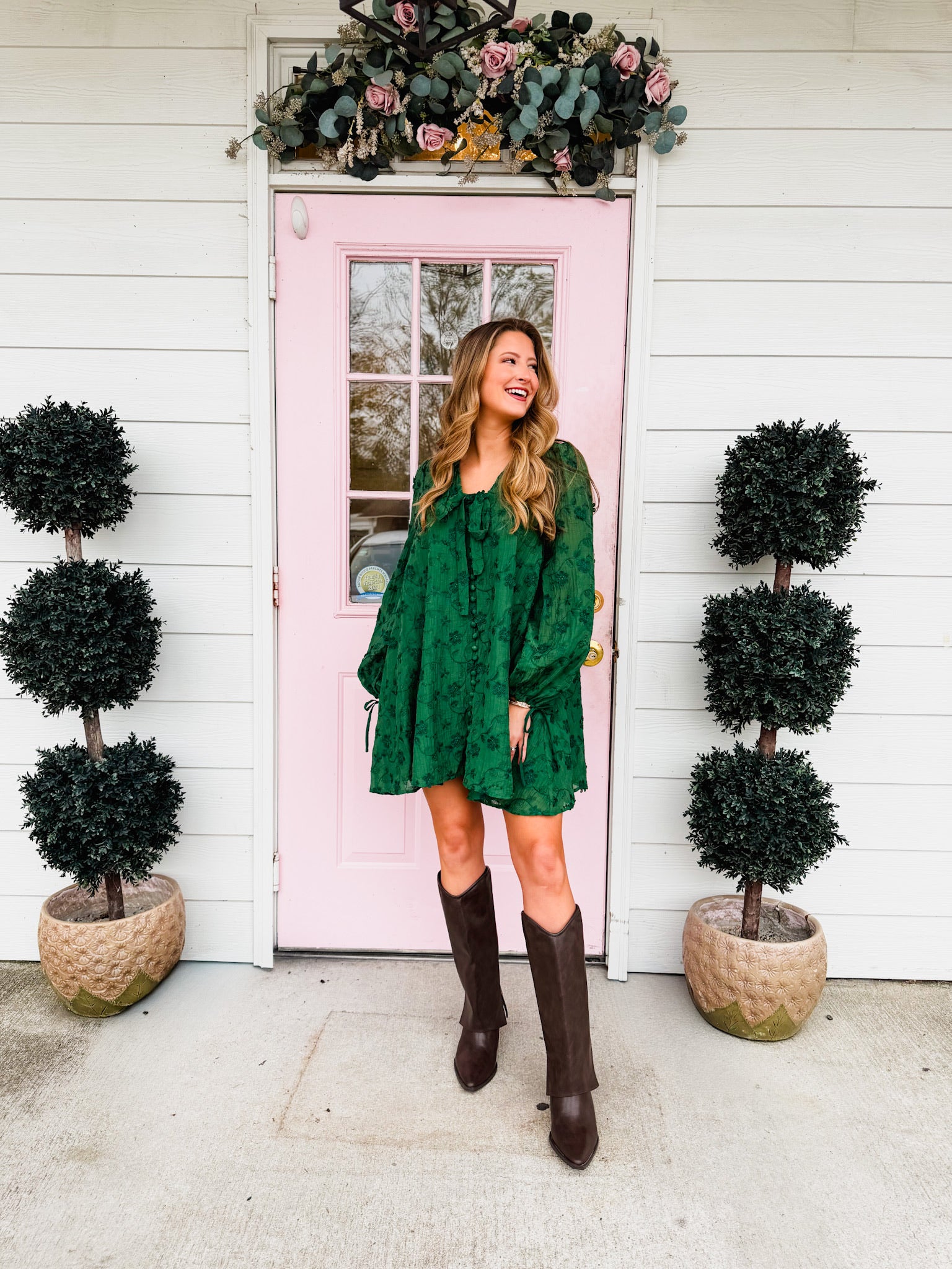 Twirl into elegance with this enchanting forest green dress, where delicate floral embroidery dances across the fabric. The charming bow detail adds a touch of whimsy and sophistication, making it perfect for special occasions or when you want to feel absolutely fabulous. Crafted with care, this dress combines timeless style with playful flair—your new go-to piece for turning heads and spreading joy wherever you go.