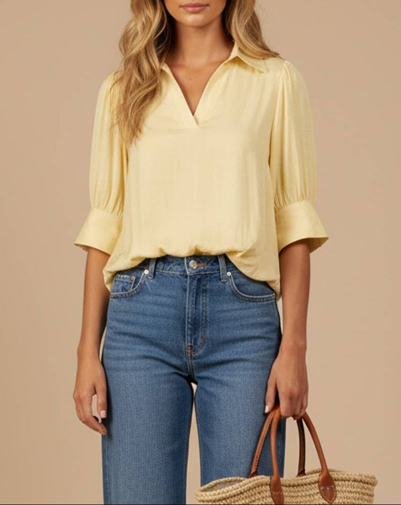 Elevate your casual wardrobe with this playful half-sleeve blouse featuring a charming bubble hem and flattering hi-lo silhouette. The soft pale banana hue brings warmth and versatility to any outfit, while the relaxed fit keeps you comfortable all day long. Perfect for pairing with your favorite jeans or dressing up for a night out, this blouse strikes the ideal balance between fun and effortless style. Don't slip up on this wardrobe essential—it's the piece you didn't know you needed!