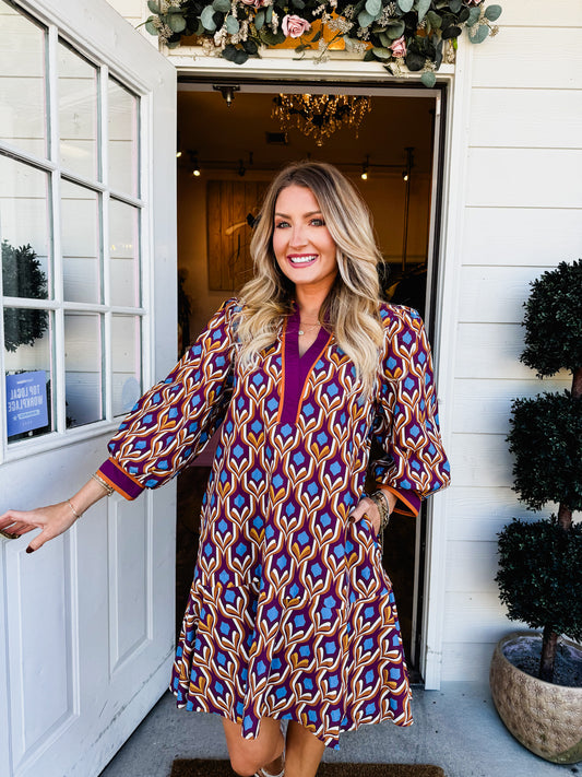Add It Up Geometric Print Long Sleeve Dress - Wine