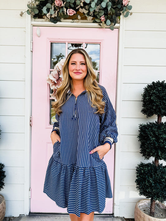 Lazy Sunday Stiped Long Sleeve Dress - Navy