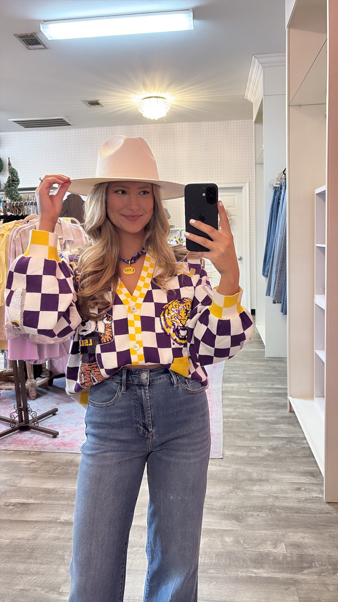 Queen Of Sparkles Licensed LSU Checkered Team Icons Cardigan