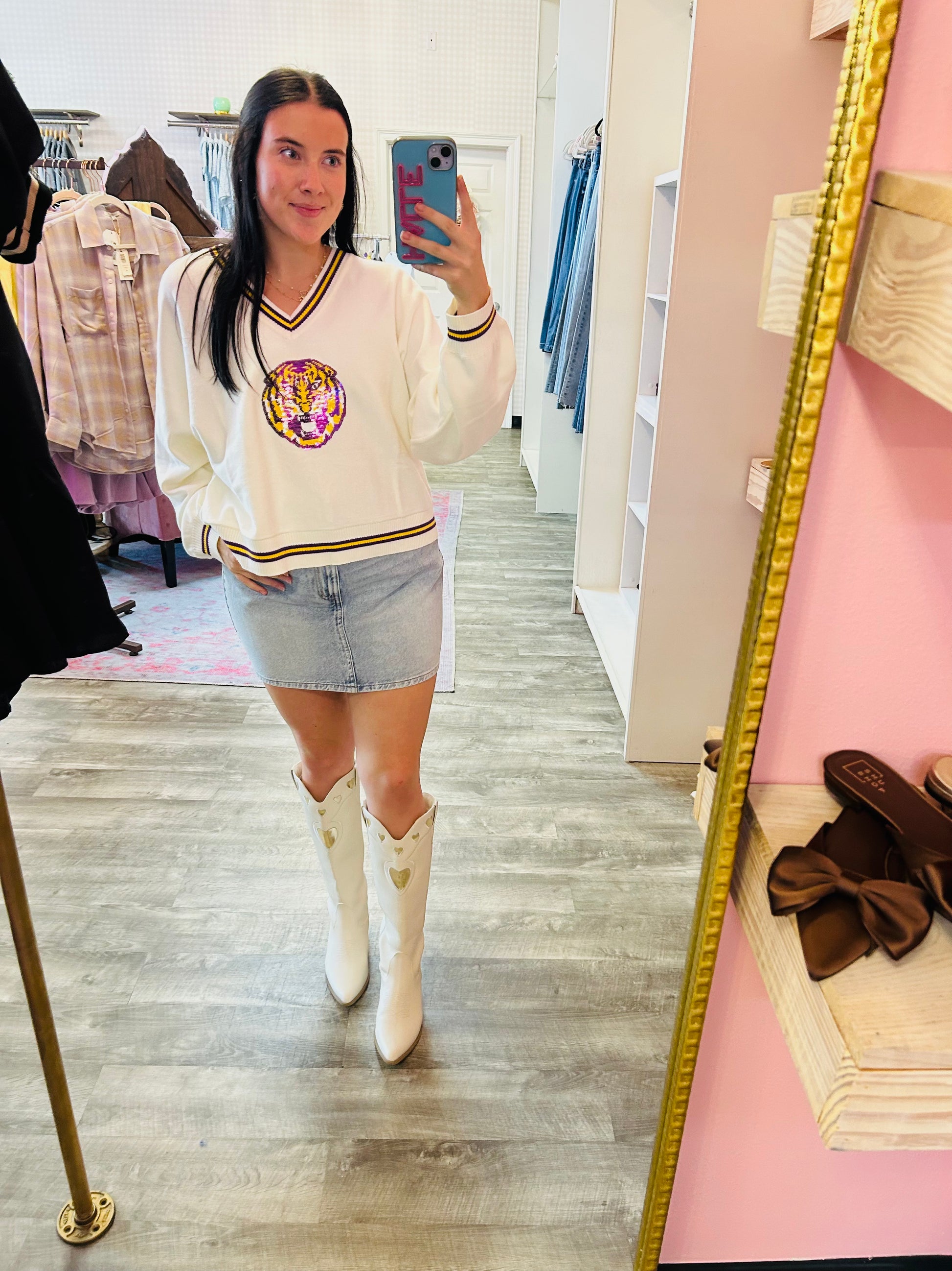 Show your LSU pride with a fun twist in the Queen Of Sparkles Licensed LSU V Neck Striped Cuff LS Sweater. This playful sweater features classic striped cuffs and a charming small mascot, adding a touch of personality to your game day look. Its V-neck design keeps things stylish while you cheer on your team in comfort and flair.