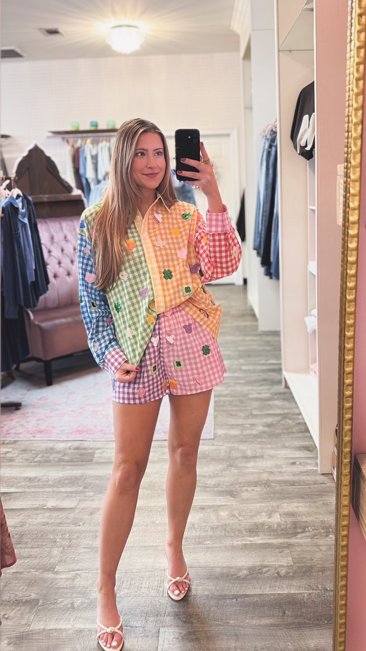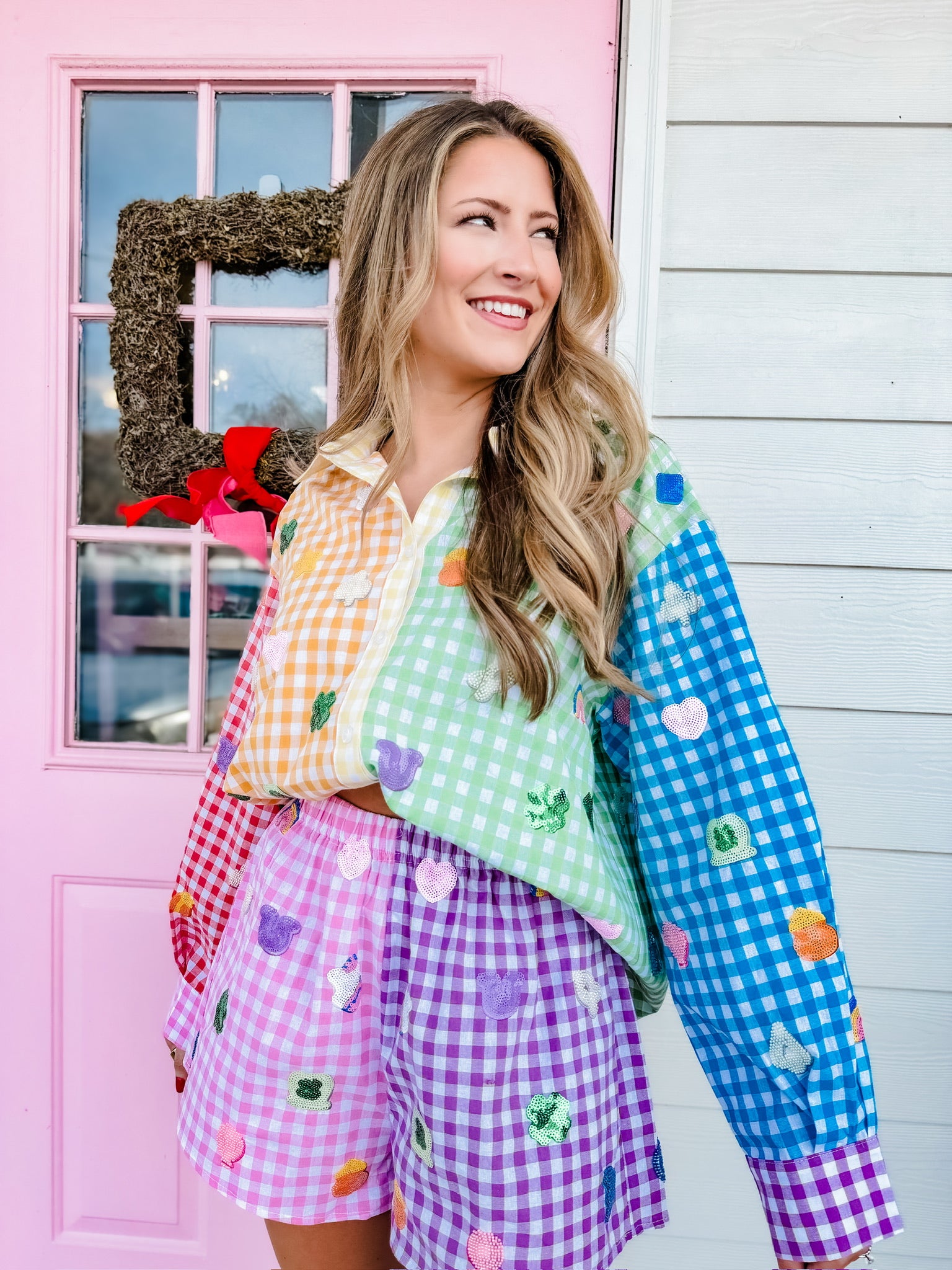 Queen of Sparkles Rainbow Gingham Colorblock Lucky Charms Button Up Cotton Top