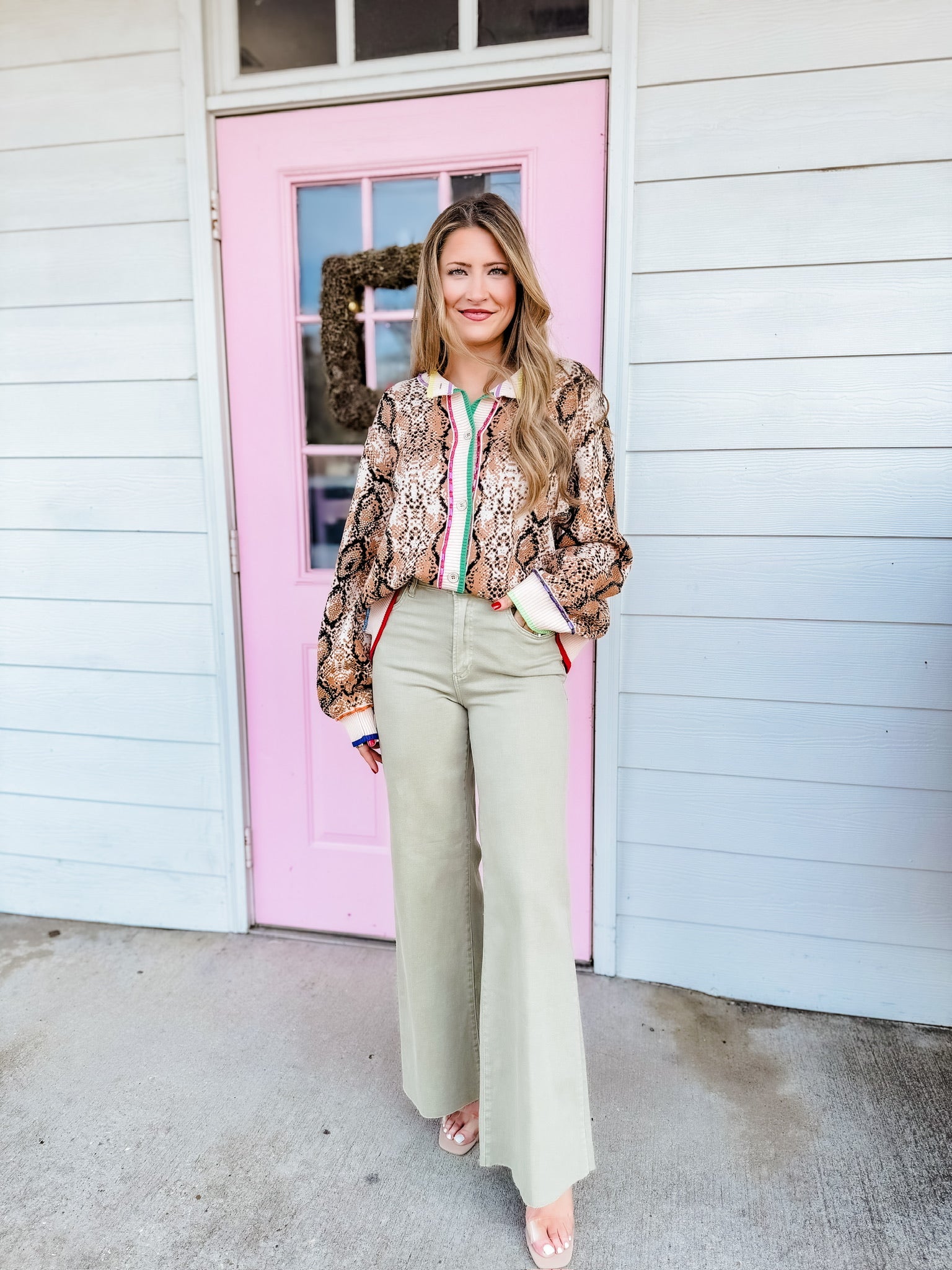 Queen of Sparkles Snake Print Rainbow Trim Button Up Sweater Cardigan