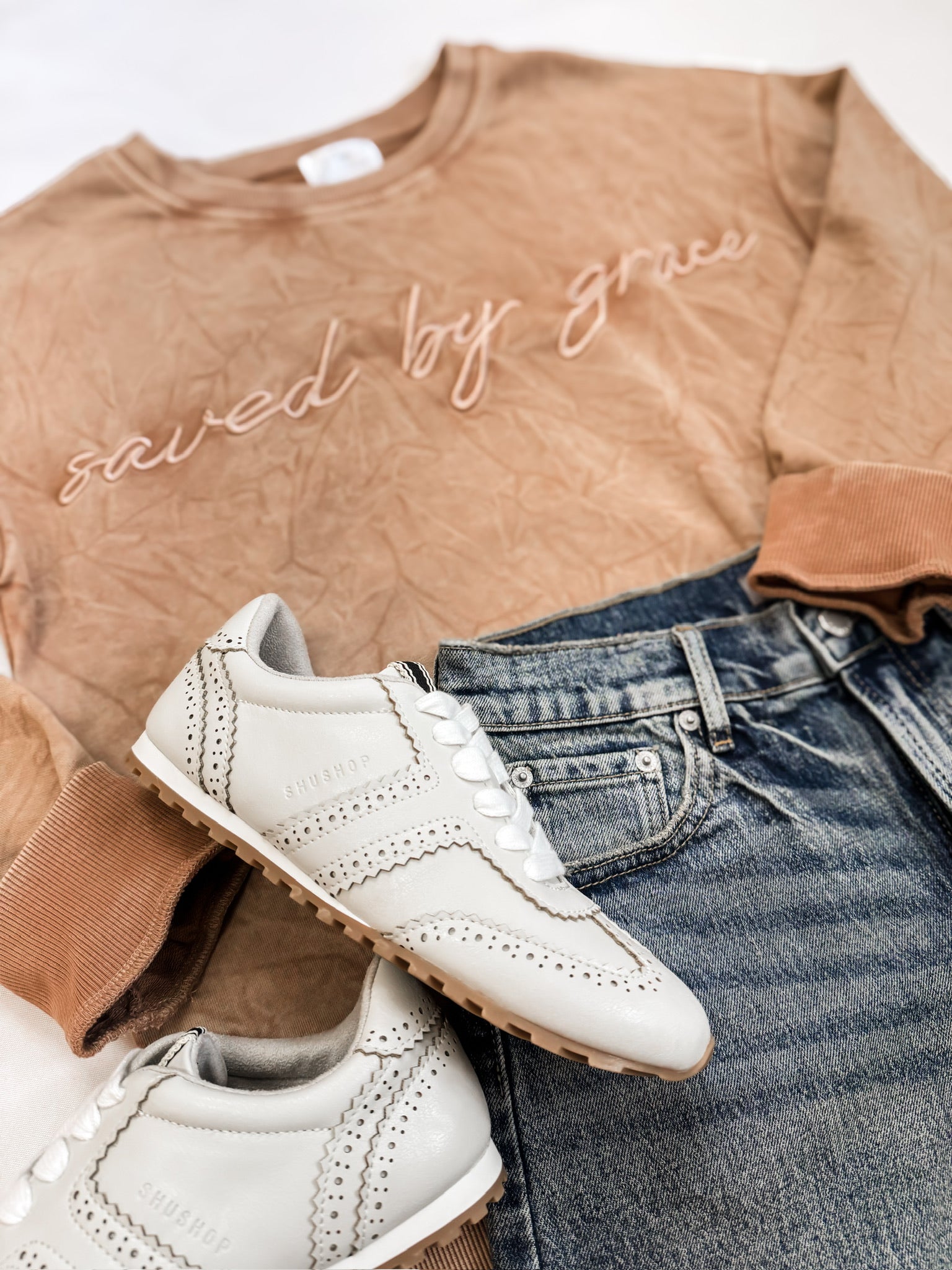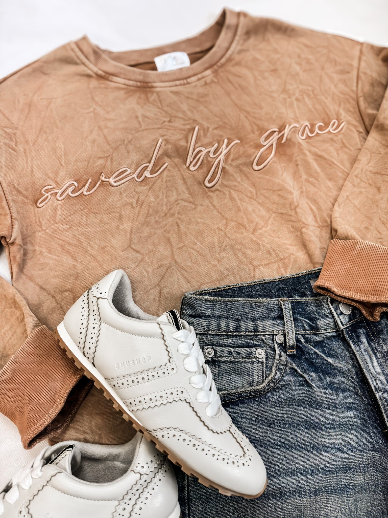 Soft washed long-sleeve sweatshirt in tan with embroidered-style 'saved by grace' script across the chest for a faith-filled statement look.