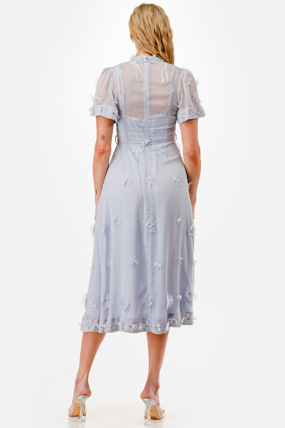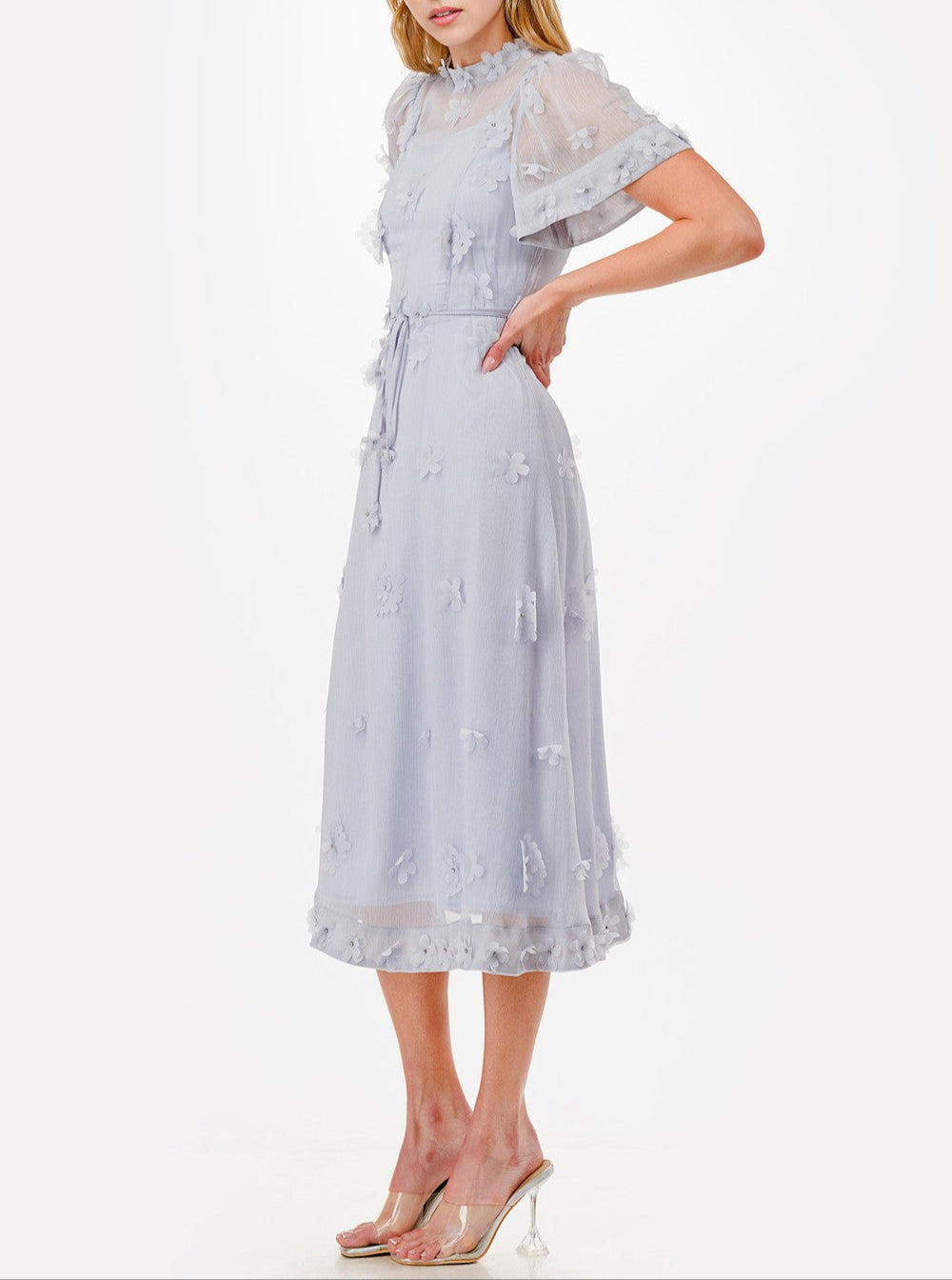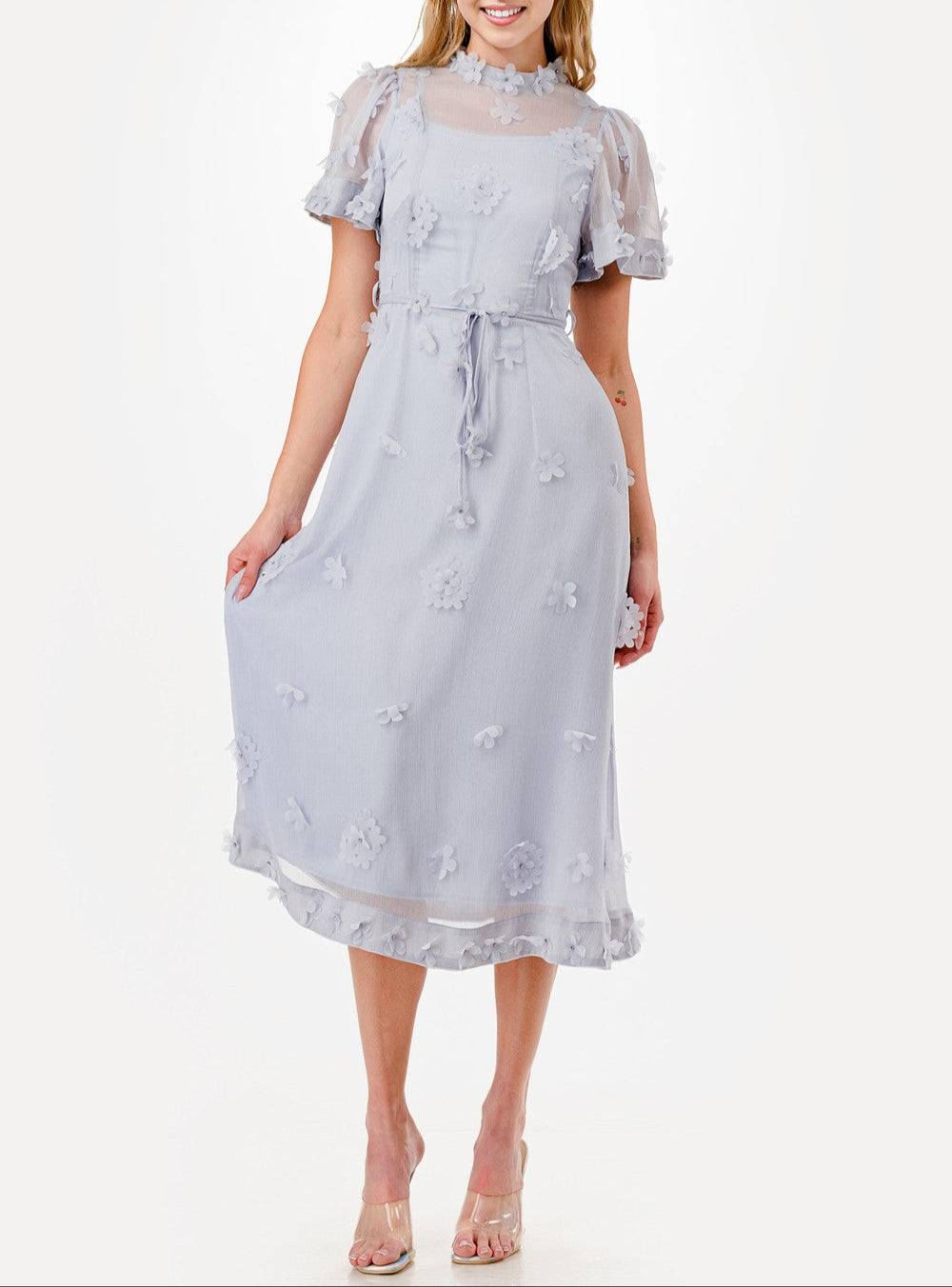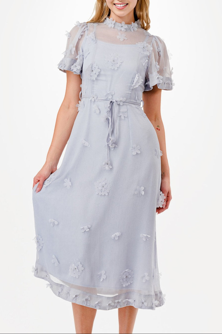 Be the trendsetter you were born to be in our Delicate Flower dress. Short sleeves, a mock neck, and a back zipper make this midi dress both stylish and easy to wear. Plus, the 3D floral details and waist tie add a touch of whimsy to any outfit. Get ready to turn heads (and bloom) in this must-have dress!