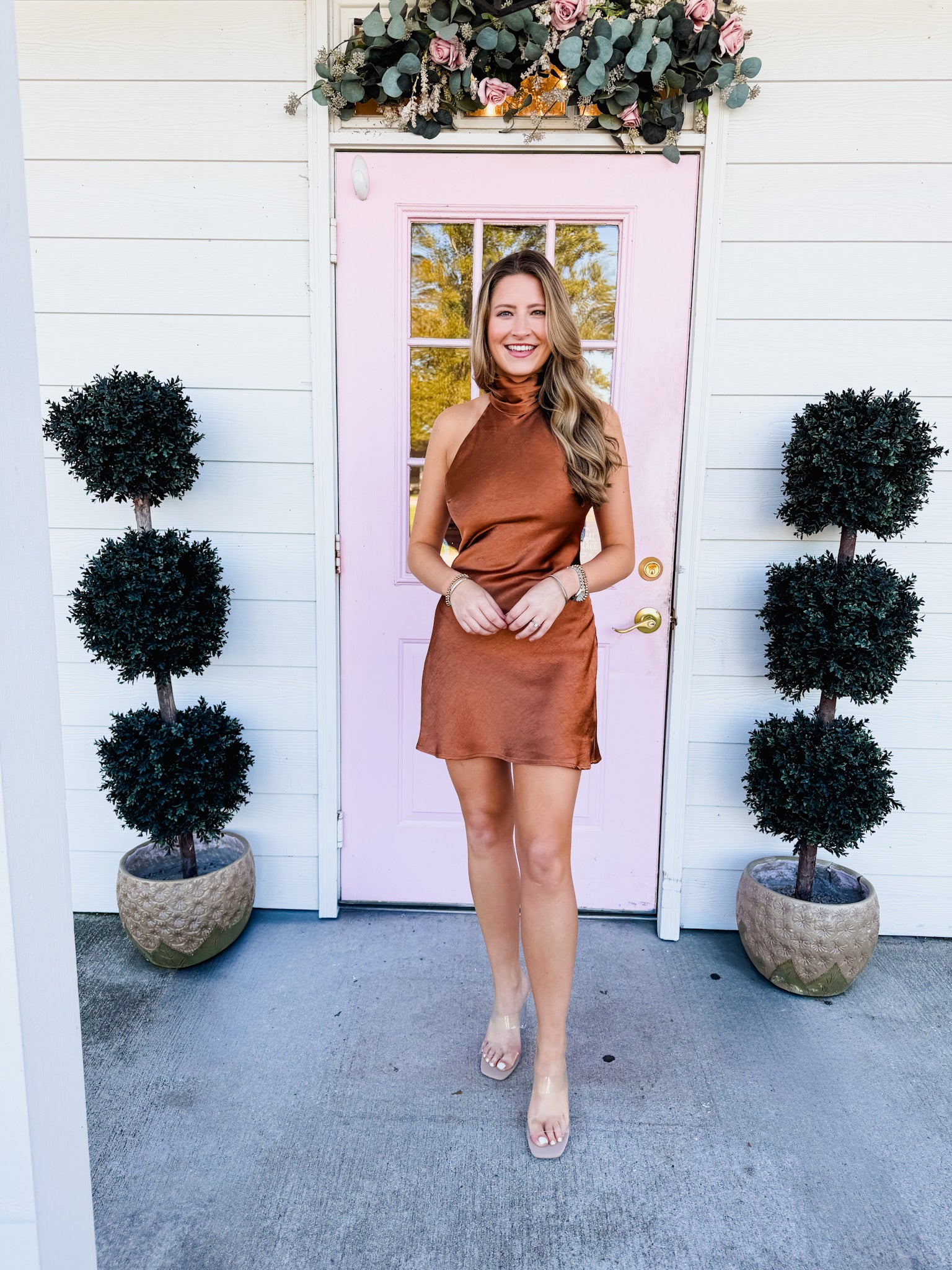 Sweet Deal Halter Neck Backless Satin Dress - Bronze