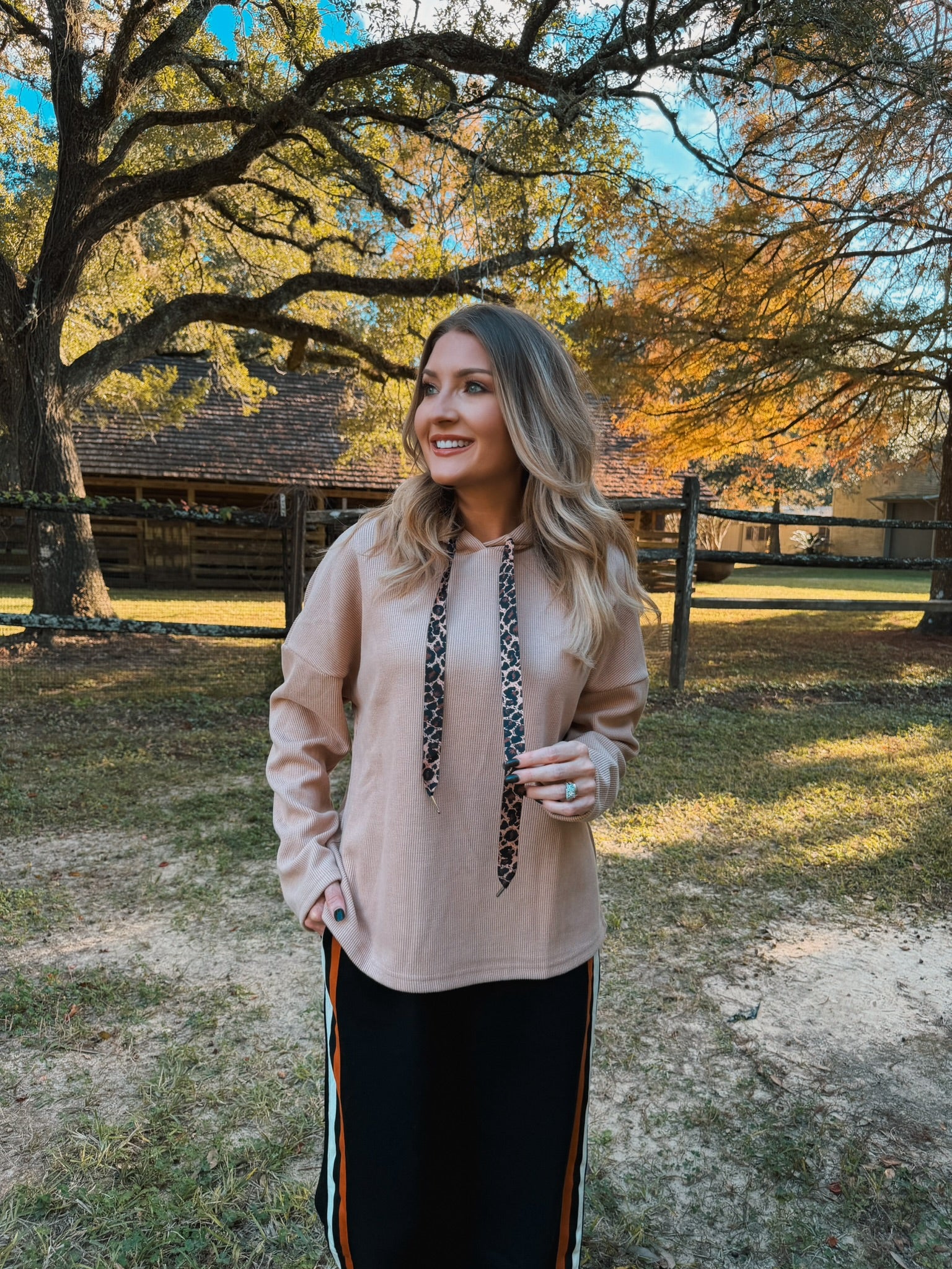 Thermal Leopard Drawstring Ribbed Baggy Hoodie - Dark Khaki