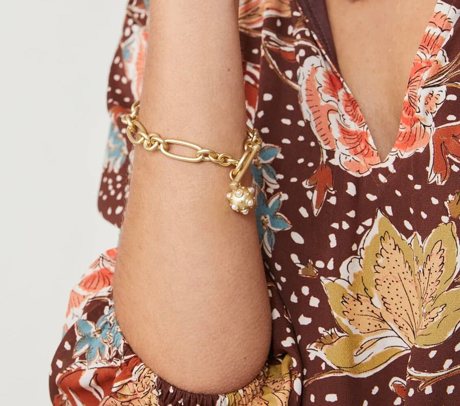 Our Vintage Ball Toggle Bracelet features a classic charm style encrusted with faux pearls in 18kt matte gold plating. A classic you will be pulling out of your jewelry case again and again.