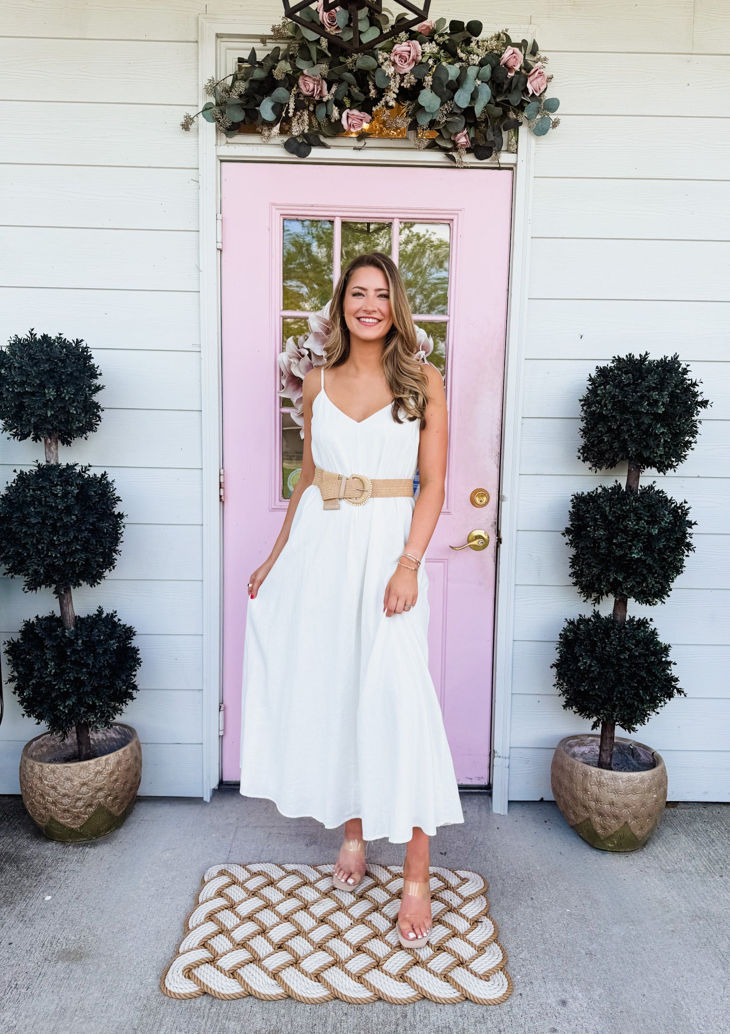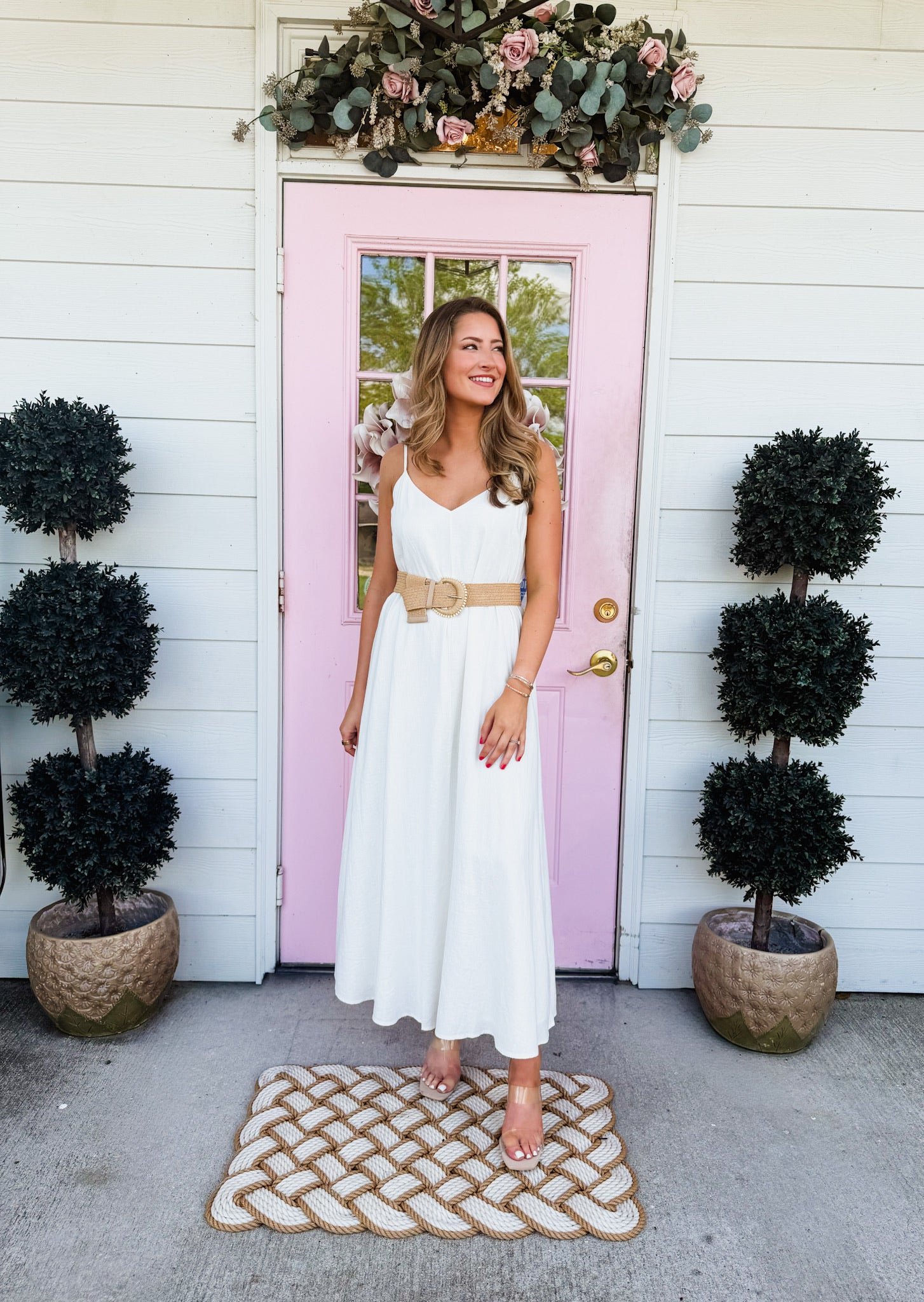 With a relaxed silhouette, soft v-neckline, and subtle stripes, this midi dress delivers effortless summer ease. Crafted from an airy, light textured linen fabric, it works just as well styled as a summer dress or as a breezy cover-up.