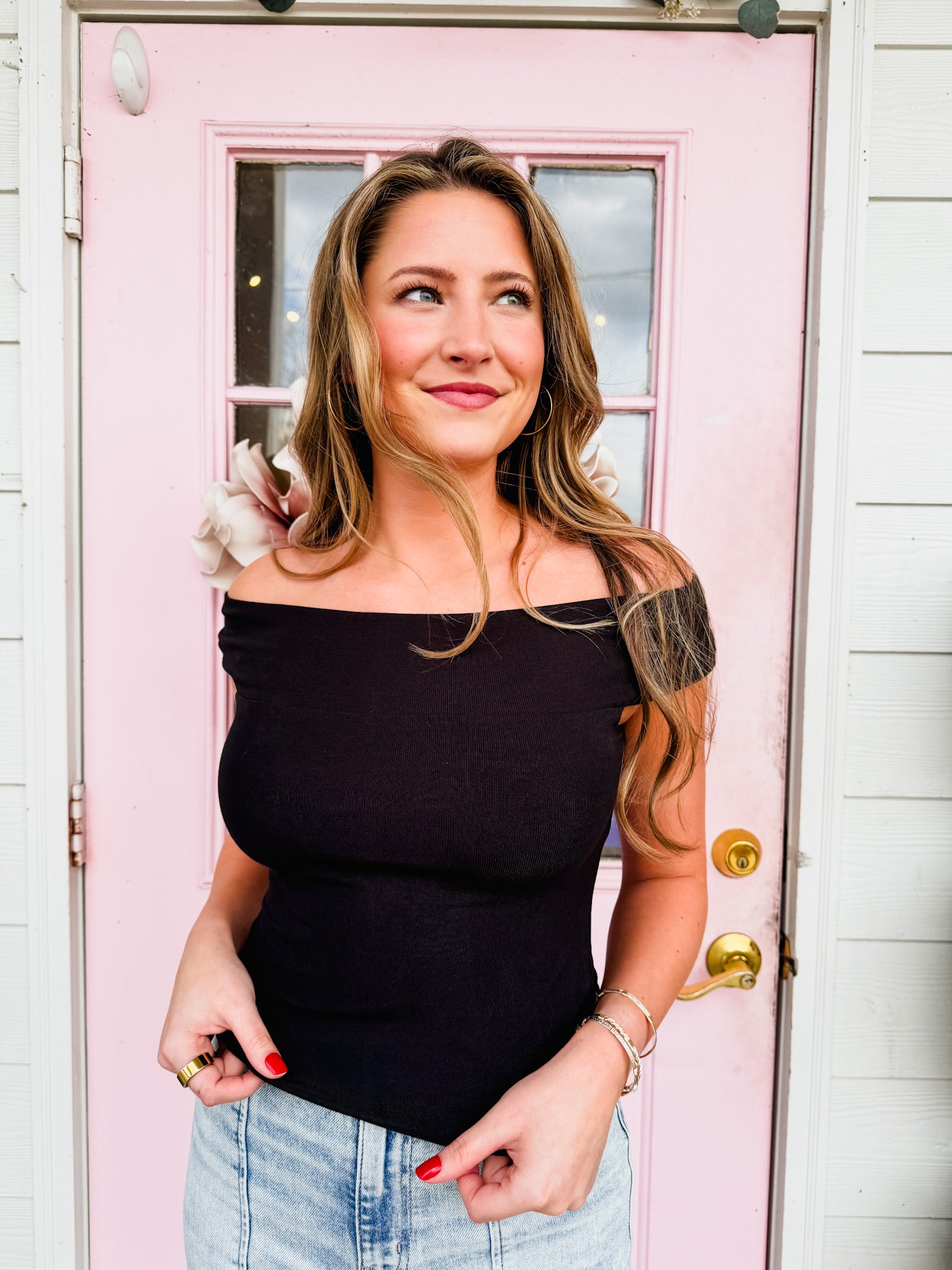 Soft, smooth, and body-hugging, this off-shoulder top flatters with just the right amount of stretch. Made from our signature Second Skin rib fabric, it’s the perfect piece to dress up or pair with denim for an easy casual look.