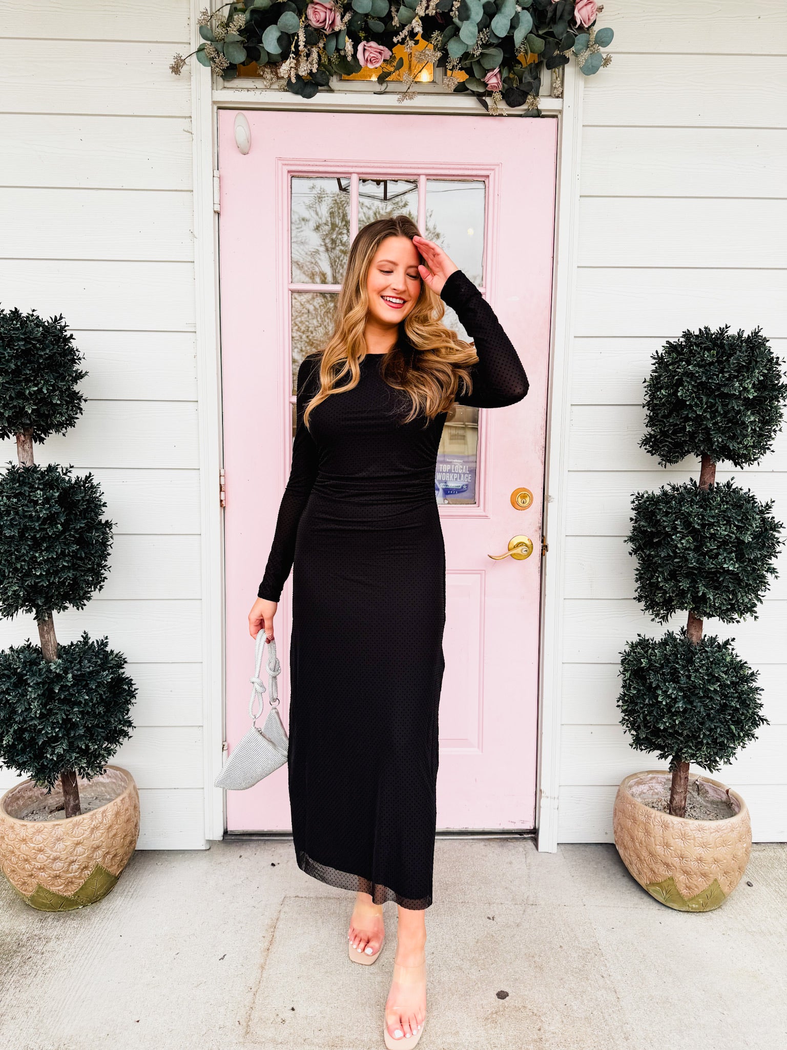 A lined bodice gives this dress comfortable coverage, while the crew neckline and long sleeves keep the look streamlined. It layers seamlessly under coats or shines on its own for night-out moments.